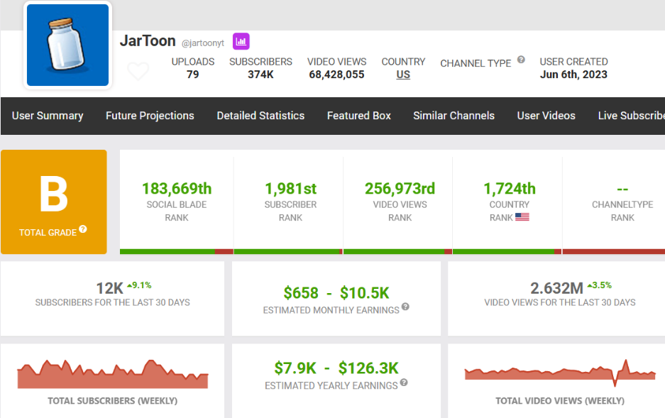卡通動漫在海外也同樣是比較受歡迎的一個賽道,你知道”寶寶巴士“一年在油管上的收入是多少嗎?500萬美元。目前這個賬號的單月收益在658-10.5k之間。如圖: