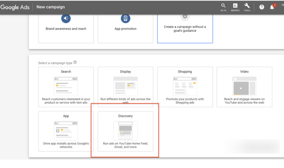 2.選擇“銷售“,”線索“,網站流量”或“沒有目標”,然后選擇“發現”(sales/leads/traffic/without goal),如圖:
