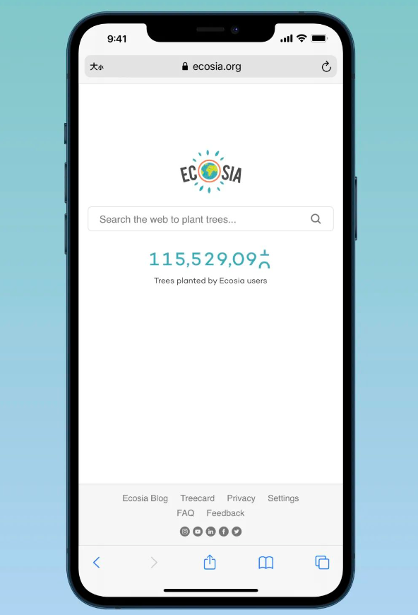 在剛剛推出的iOS 14.3中,被蘋果加入到Safari搜索引擎列表中的Ecosia就是一個特立獨行的「綠色搜索引擎」。如圖: