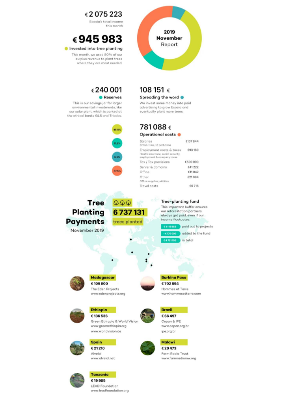 當然,45次只是一個平均值,具體的植樹細節還是和Ecosia的運營收入情況掛鉤,畢竟不是每個用戶搜索都會點擊廣告。