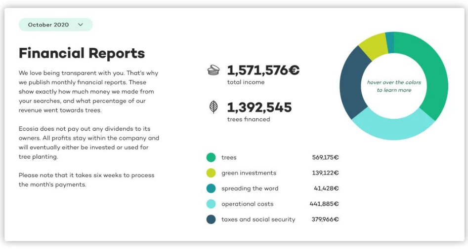 為了讓整個「搜索植樹」的運營理念更加透明,Ecosia每個月都會在官網上列出財務報告。以今年十月份為例,在150多萬歐元的總收入中,用于植樹和綠色投資的支出占據超過60%,剩下的40%則分攤到運營,營銷和人工成本。如圖: