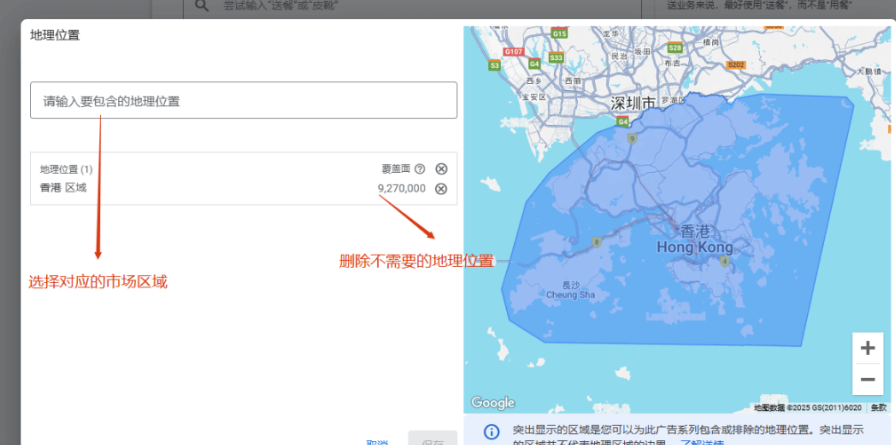 刪除不需要的地理位置,增加相對(duì)應(yīng)的市場(chǎng)。如圖: