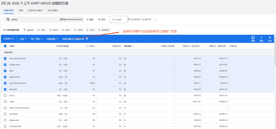 在合適的關(guān)鍵字前面打勾,添加,即可創(chuàng)建廣告組。如圖: