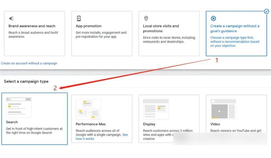在后續頁面中,選擇 “Create a campaign without a goal's guidance 創建沒有廣告系列的賬戶” 。接著,選擇廣告系列類型,通常 “Search 搜索” 類型比較適合獨立站SEO運營者,它能使網站內容在谷歌搜索結果中展示給目標客戶。