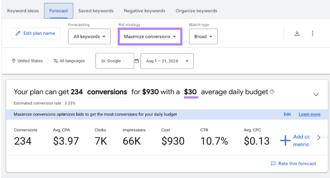 要查看使用你保存的PPC詞語的廣告活動可能會產(chǎn)生的效果,請轉(zhuǎn)到關(guān)鍵詞規(guī)劃師中的“預(yù)測”選項卡。如圖:
