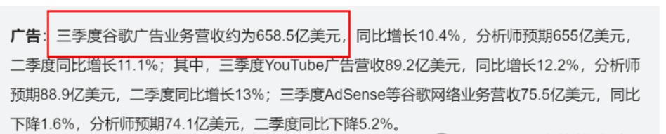 如下圖,2024年谷歌公司第三季度,單單廣告業務營收就達到了658.5億美金,而對比的話,國內騰訊公司第三季度整體營收(包含廣告,游戲等全部業務)才230億美金,可想而知谷歌的財大氣粗都是廣告商們貢獻出來的。如圖: