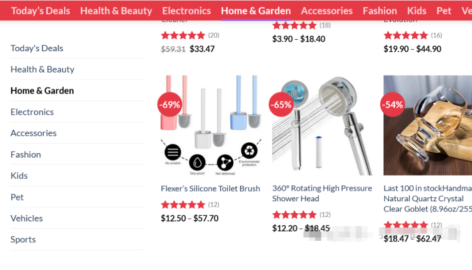 這個是雜貨鋪網站,就是什么產品都賣的,可以看到網站有很多的產品分類,健康護理,電子產品,服飾,兒童,寵物等等。如圖: