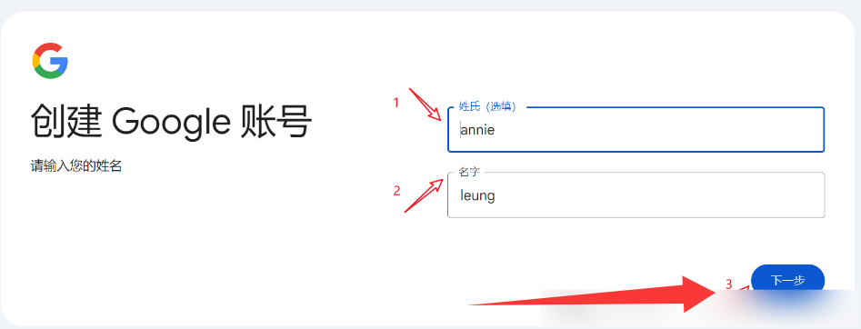 第五步:分別填寫姓氏和名字,中英文都應該可以,一般我會填英文;填完后,點擊“下一步”;