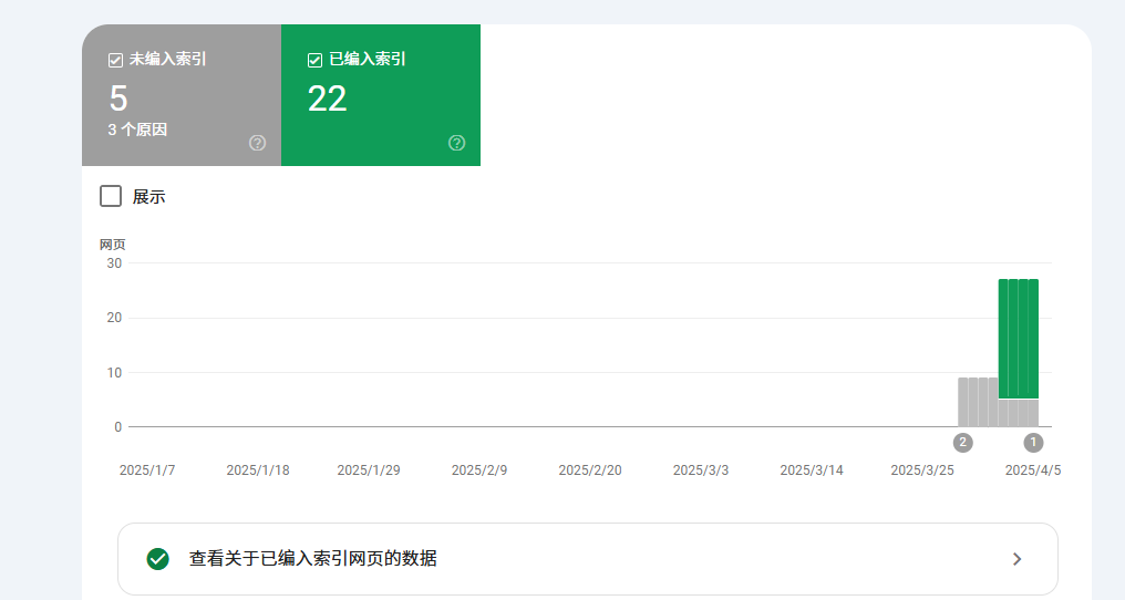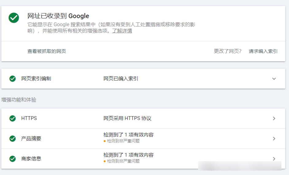 網頁索引編制:即索引狀態,頁面是否被谷歌收錄索引,綠色就是正常收錄了