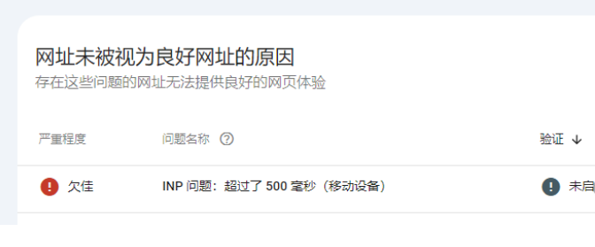 在這里,我們看到原因是INP問題:超過了500毫秒而未通過核心網頁體驗測試。