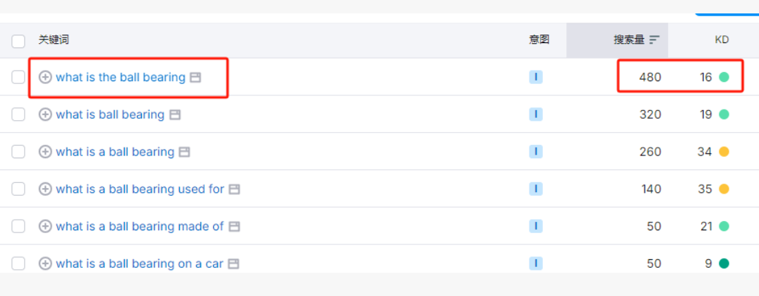 在選擇詞的時候,一定要選KD值較低并且有流量的關鍵詞,這種是最容易獲得排名的。建議選擇KD值在20以下的,可以用Ahrefs或者SEMRUSH去尋找。如圖: