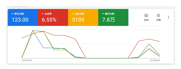 因為做的是B端類型的網站,所以只投的搜索廣告類型,像展示、Pmax這些沒有投放。當月通過廣告也拿到了123次轉化,有效詢盤有70條左右。當然,因為是新賬戶沒任何數據,從0開始跑,詢盤成本在300左右,還是略高的。