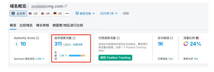 這時候是25年的1月份,網站從上線到現在已經半年的時間了,出詞已經做到了1.4K,300多的流量。雖然稱不上優秀,好在數據一直在增長,并且是這位學員每一篇文章都是按照我們寫文章的SOP執行自己寫的,沒有外包寫手。如圖: