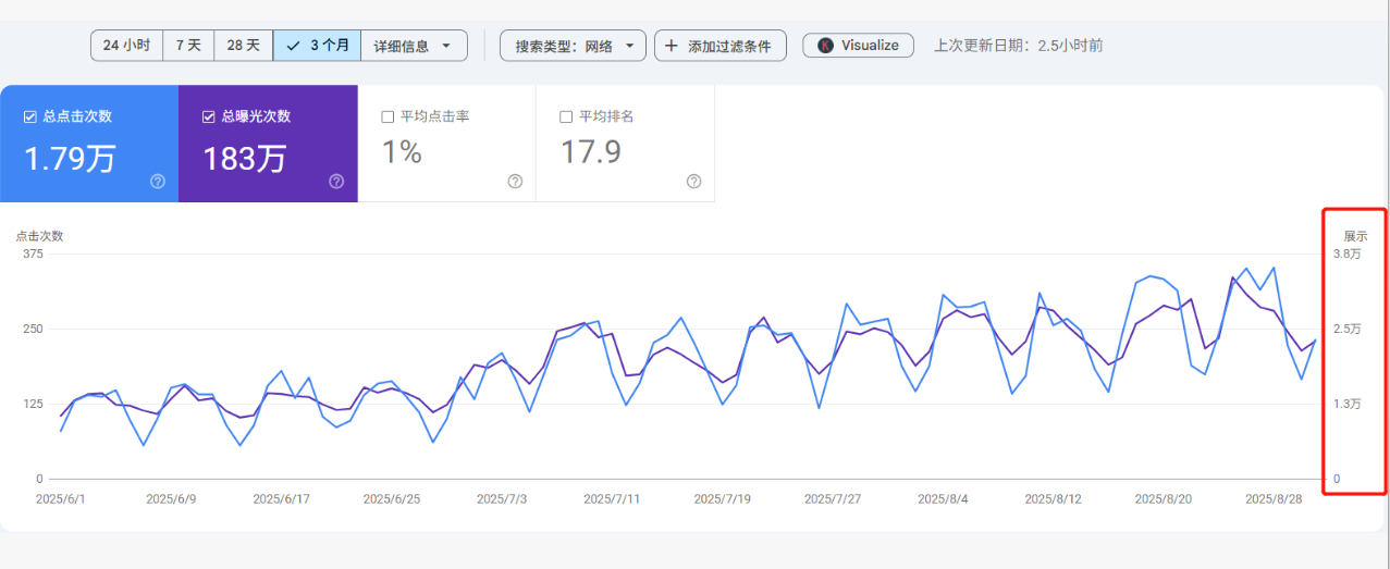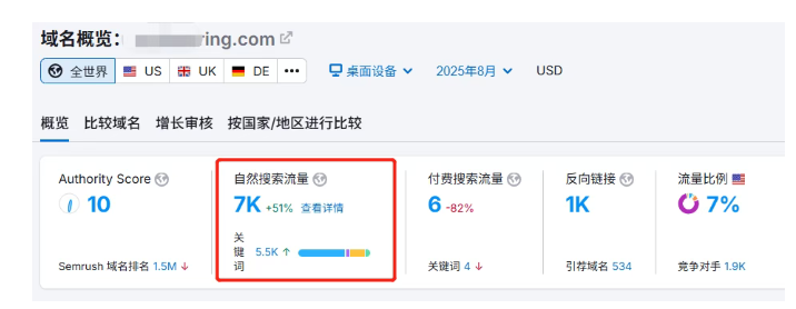 在2025年6月底,谷歌在今年的第二次核心更新。本次更新,該網站流量及出詞依然很明顯,目前出已經達到5.5K,自然流量7K。目前詢盤已經過百。如圖: